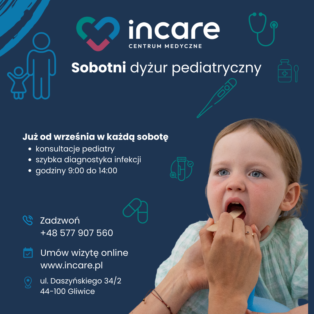 Drodzy Rodzice! Już od najbliższej soboty zapraszamy najmłodszych pacjentów na sobotnie dyżury pediatryczne w InCare Centrum Medyczne Gliwice.